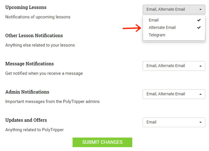 If you want, you can make changes to which notifications you would like to receive. Please note that these notifications will not work until your alternate email is completely set up (see