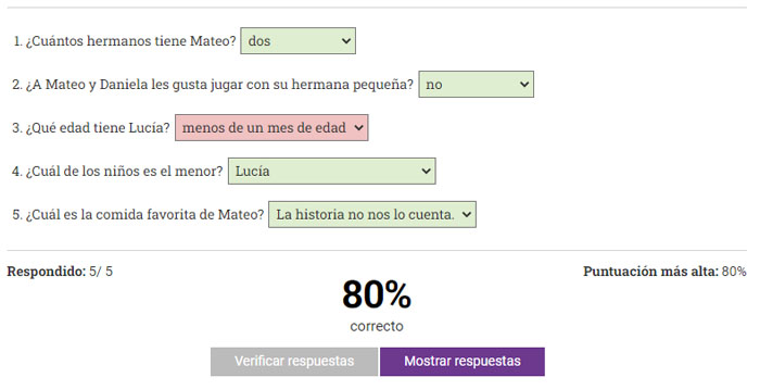 Después de que el estudiante intente responder todas las preguntas y haya hecho clic en el botón Verificar respuestas, mostraremos cuáles de