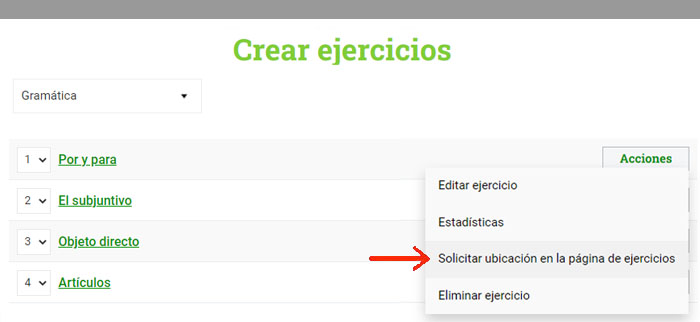sea ubicado en nuestra página principal de Ejercicios. Puedes hacerlo en la página Crear ejercicios.
