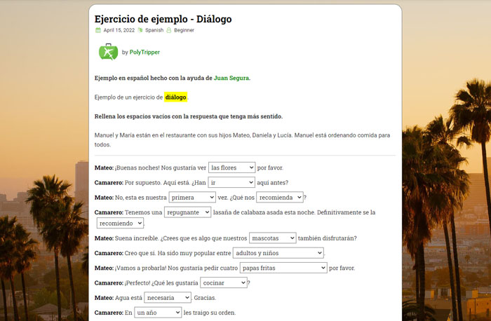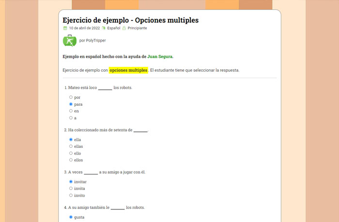 Tus ejercicios son para tus propios estudiantes de PolyTripper. Después de crear un ejercicio, puedes darle el enlace a uno de tus estudiantes. También puedes solicitar que tu ejercicio