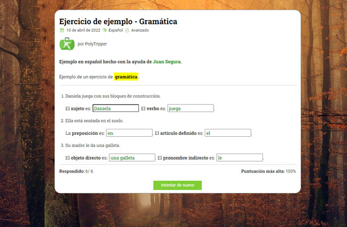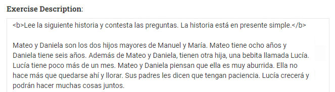 En la parte "Ejercicio" pondrás las frases del ejercicio. Te explicaremos en detalle cómo hacer esto en el resto de este tutorial.