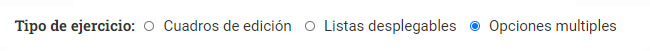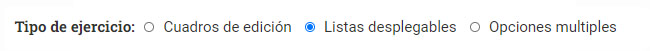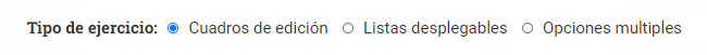 Los tres tipos de ejercicios que puedes crear son ejercicios con cuadros de edición, listas desplegables y opciones multiples. Podemos tratar de explicarte cuáles son entrando en