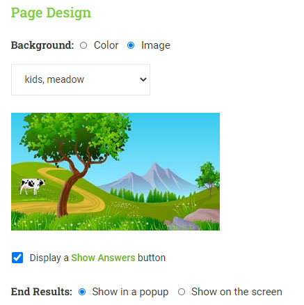 In the Page Design part you can choose the background of your exercise. You can choose one of our colors or pick your own color. You can also choose one of
