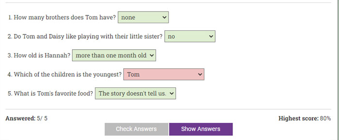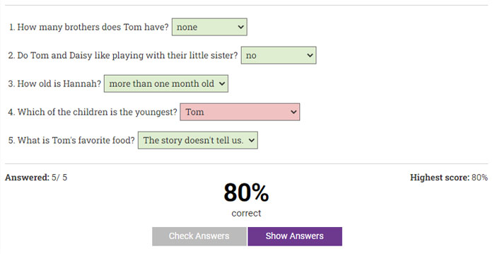 After the student tries to answer all the questions and has clicked on the Check Answers button, we will show which