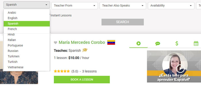 You can also filter teachers by where they are from, which additional language they speak and when they have availability. The last filter options help you determine exactly what type of