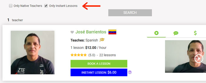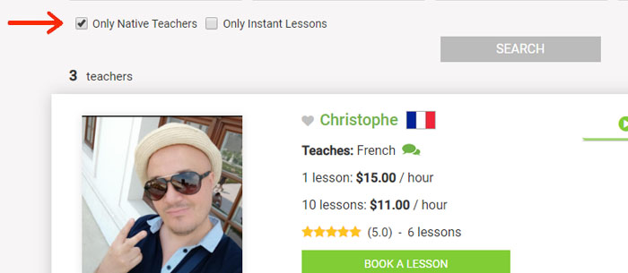 If you prefer to take lessons with native teachers, you can choose to only display those teachers right at the top of the screen.