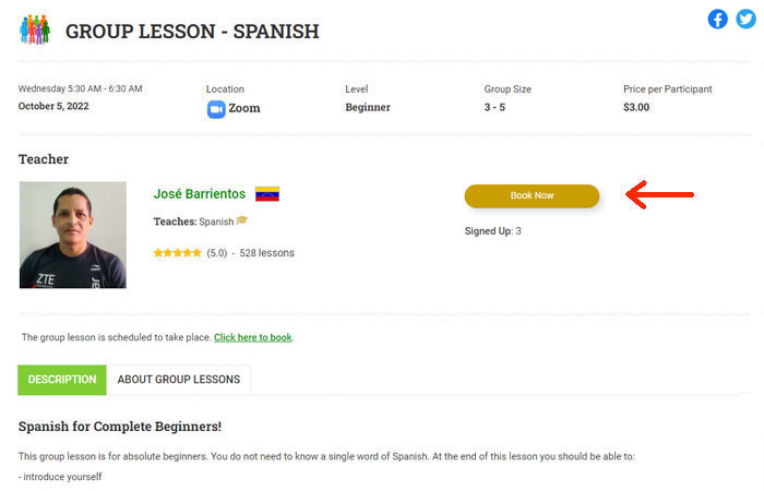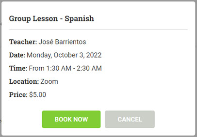 When you click the button, you will see the information for the lesson and you can reserve your spot.