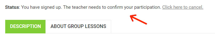 The teacher has the option to choose to automatically accept students into the group lesson or to confirm each participant manually. If the teacher has chosen to manually confirm, you will see the message "The teacher needs to confirm your participation" (see image). Once your participation has been confirmed by the teacher, you will receive a message informing you of this.