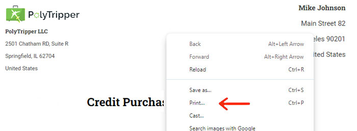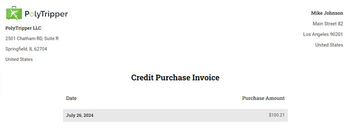 When you click on "invoice", you will get a printable page with the credit purchase on it. If you want to display your full name and address on the invoice, you can fill those in at this link.