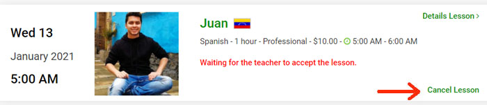 Before the teacher has accepted a lesson request, the lesson can be canceled by the student by clicking on . All credits will be returned to the student's PolyTripper account. If the lesson was part of a package, the lesson will be returned to the package.
