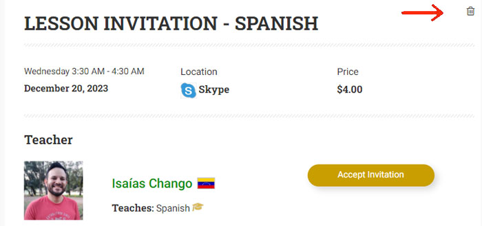 Please note that when you create a lesson invitation, the date and time of the invitation will be automatically blocked on your calendar. This means that no other student will be able to book a lesson at that time and you will also not be able to create another lesson invitation for the same time. If you need to delete an invitation, you can do this by clicking on the little garbage can on the top right of your screen (see image below). This garbage can is only visible by you.