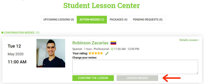 If you want to request a refund, you need to do this before the lesson is confirmed. After a lesson is confirmed - either by the student or automatically - it is no longer possible. Regular and group lessons are automatically confirmed after 2 days, instant lessons after 6 hours. If you are requesting a refund, because the lesson did not take place, please click on the button of the lesson in question.
