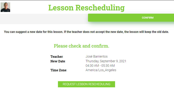 Teachers can request to reschedule as long as the lesson has not yet been confirmed, canceled or rejected, even after the lesson was supposed to have taken place.