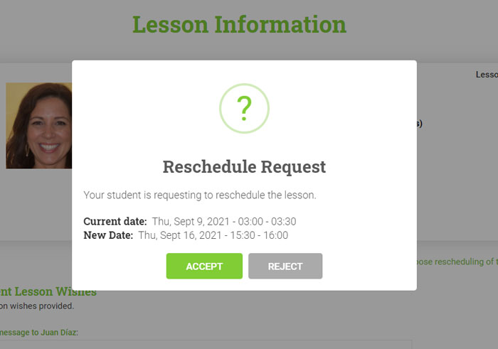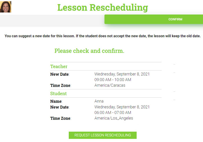 Teachers will see more detailed information on the confirmation screen. They will be able to see the lesson time chosen both in their time zone and the time zone of the student. This can especially be handy if the student is asking the teacher to do the lesson at a certain time.