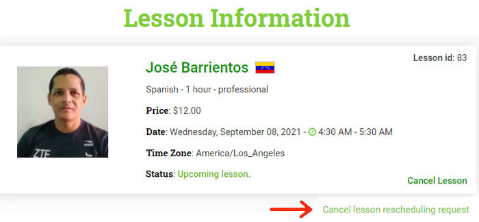 Students can request to reschedule a lesson up to 24 hours before the start of the lesson. However, they can only do so if the lesson has not yet been canceled or rejected by the teacher. If the option is not displayed on the lesson details page (see image above), it means that they are unable to reschedule.