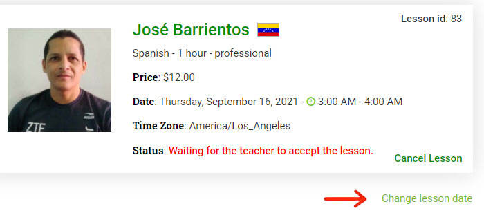 If a lesson has not yet been accepted by the teacher, the student can simply change the lesson date and will see the option Change lesson date instead of Propose rescheduling of the lesson. This can be very handy if you accidentally scheduled your lesson at 3:00 AM instead of at 3:00 PM.