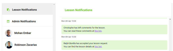 At the top of the message center, you will see your lesson and admin notifications. These notifications are for information only. You will not be able to reply to them. Below appears a list of everybody you've sent messages to or who've sent messages to you. Clicking on a person will