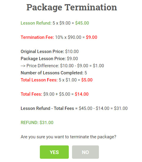 a termination fee of 10% of the price you paid. We will also convert the lessons you have already taken to their non-package price. The refund you will receive