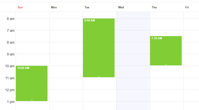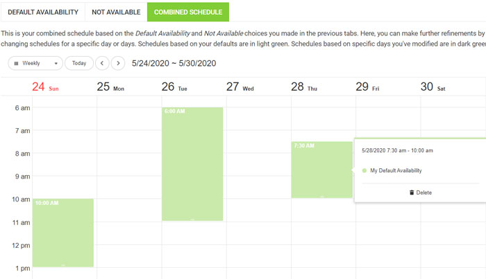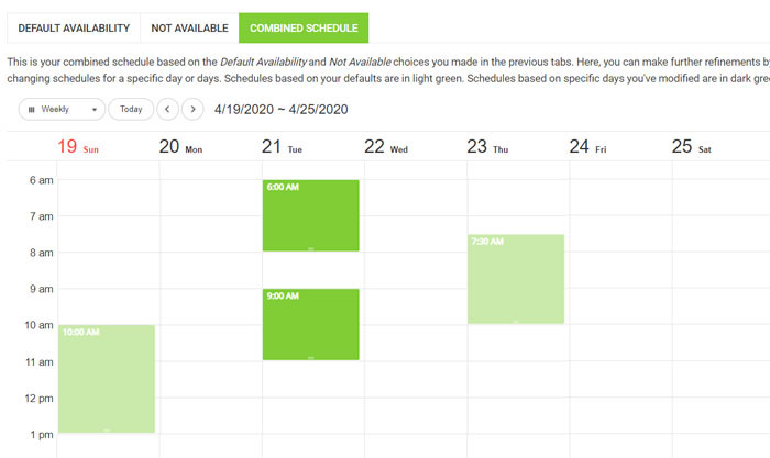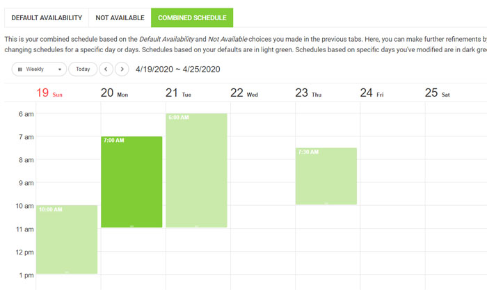 You can use this tab to set up the times when you are almost always available. For instance, if you know that you are able to teach pretty much every Sunday from 10 in the morning until 1 in the afternoon, every Tuesday from 6 until 11 in the morning and every Thursday from 7:30 until 9 in the morning, then you can mark that in the default availability schedule like this: