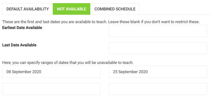 This tab can be used to provide the earliest and last dates that you will be teaching. You can also leave them blank. You can also mark ranges of dates where you won't be available to teach. For instance, if you will be going on vacation from September 8th until September 25th, then you can fill that in as follows: