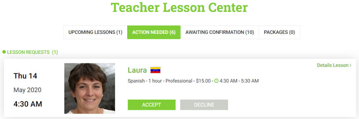 This tab will show you all the lessons that have been completed and are awaiting confirmation. After they are confirmed, you will receive your payment. Students have 2 days to confirm regular lessons and 6 hours to confirm instant lessons. If after this time they are not confirmed, they will be automatically confirmed. After they are confirmed, they will appear on the action needed tab, where you can leave a comment for the student.