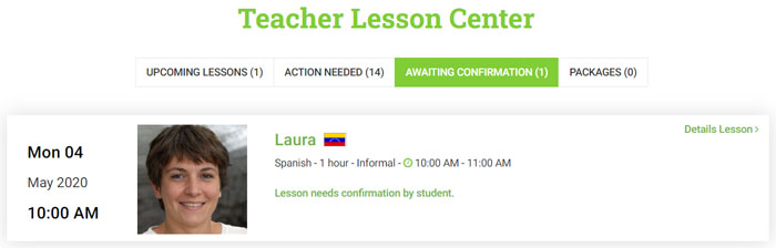 The teacher lesson center will show you all you need to know about your lessons and packages.