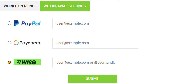 Right now, we work with PayPal, Payoneer and Wise. Make sure you have chosen a withdrawal method and entered in your withdrawal identifiers at