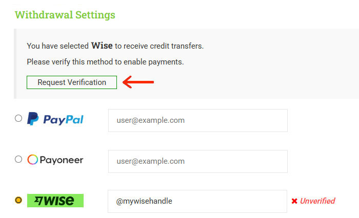 You can set up more than one withdrawal method at the same time (for example, PayPal and Wise), and switch between them whenever you need to. However, if you switch to a different account — with another email or username, even if you've used it before — you'll need to go through the verification process again. This is necessary for legal and security reasons.