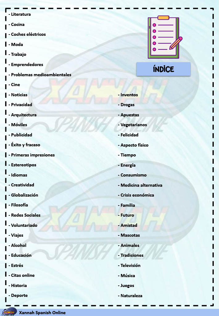 10 fichas de conversación (PDF), con 12 preguntas cada una, para conversar y 2 fotografías cada una para describir. Ideales para los niveles B1, B2 y C1.
