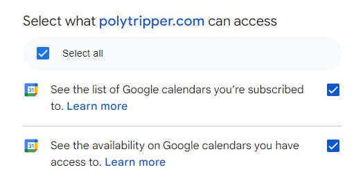 After you've given us permission to integrate your Google Calendars, you will see a list of your calendars. Put a check mark in front of the calendars who's busy times you want us to block in PolyTripper.