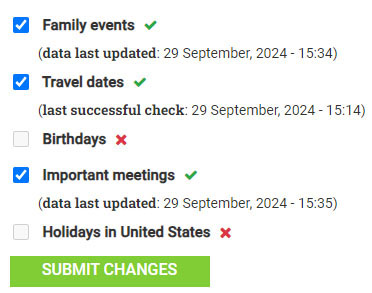 If you see a red cross it means that no connection could be established. This doesn’t always mean there’s a problem. Some calendars, like "Holidays in the United States" or "Birthdays," can’t send updates to PolyTripper. However, if the calendar you’re trying to integrate has important dates you need blocked, please contact us.