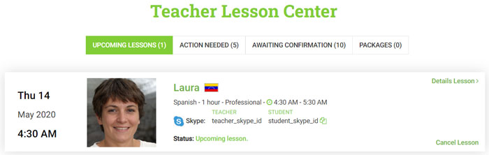 The teacher lesson center will show you all you need to know about your lessons and packages.