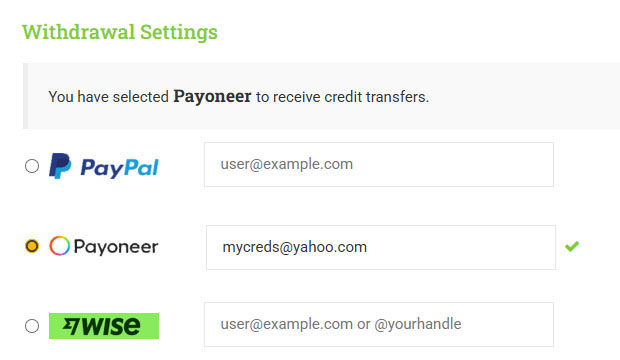 Right now, we work with PayPal, Payoneer and Wise. Make sure you have chosen a withdrawal method and entered in your withdrawal identifiers at